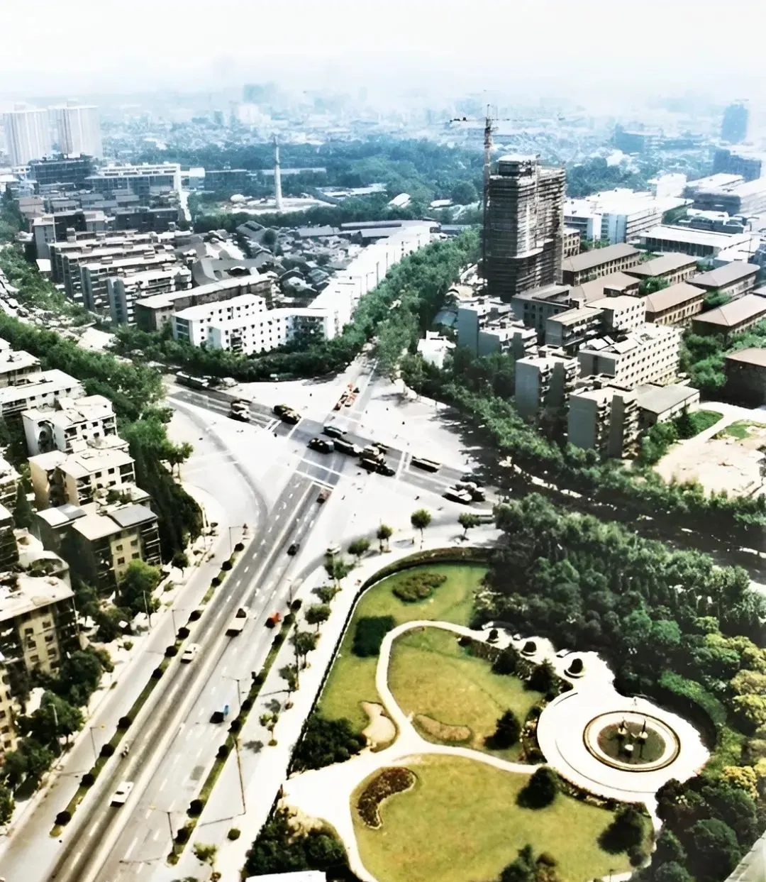图里这条直直的就是华山路,这个路口和常熟路交会,右下角吊塔探着头,正在忙活的,就是后来开业的那家大饭店,脚手架全是木杆子,工地上人影小小的,却顶着一座城往前跑。