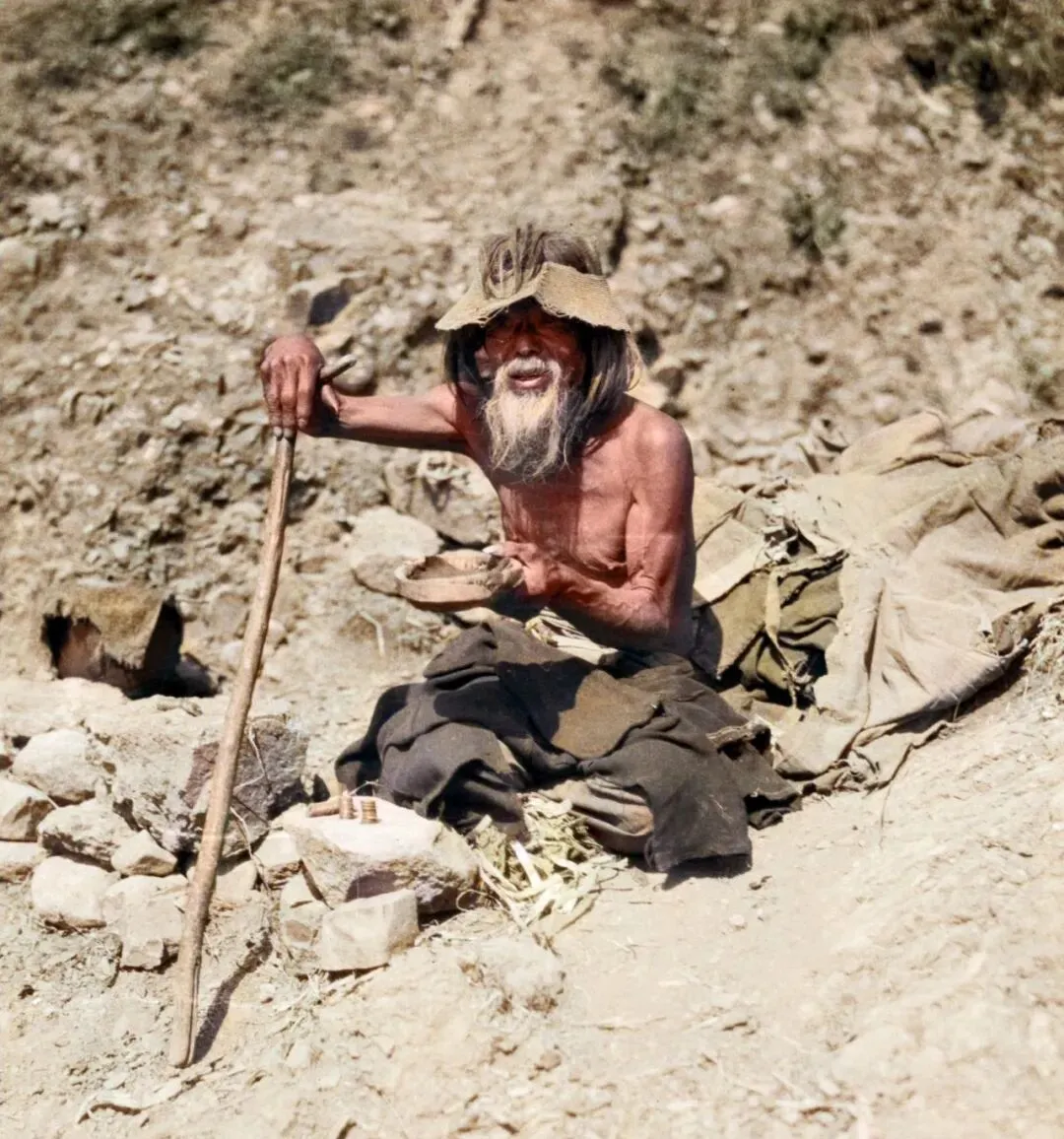 他身前的石头上摆着几串铜钱,旁边一个白口瓷坛,擦脸巾半搭不搭地盖着,坛里大概是馒头疙瘩或凉水,脚下垫的是捡来的破毯子,干巴巴的一层,坐久了腿发麻,手里的拐杖头被磨得溜圆,说明走过不短的路。