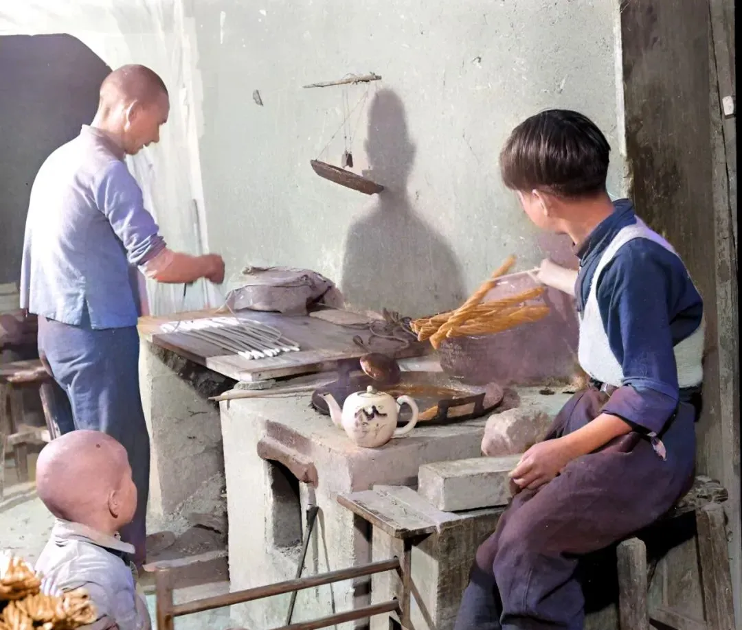 锅边的大儿子掌勺,铜勺口往里送,油面上就炸开一层芝麻似的细泡,馓子一落锅先沉后浮,金黄从尾巴一点点蔓上去,像有人在水下点了盏灯,小儿子蹲在灶前拉风箱,木柄来回一抽一送,灶膛里呼的一声亮了,火舌舔着锅底发出轻轻的哧响,家伙什不多,一个茶壶,一块炉台石,一把夹子,全靠手上功夫撑场面。
