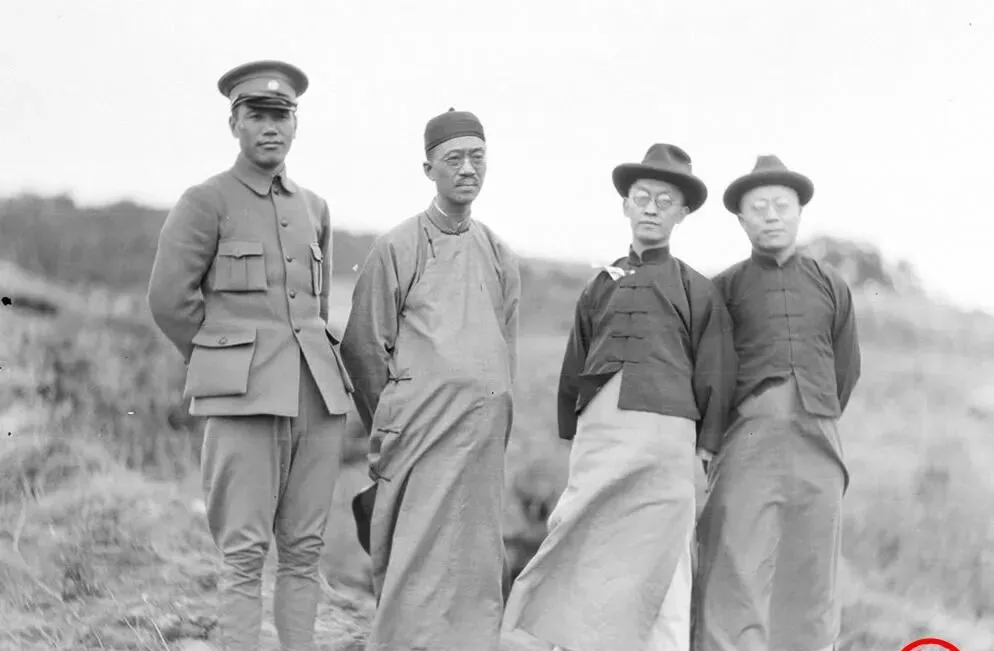 图中这处山坡的合影叫外拍照,前头一位穿军装的站得笔直,胸前口袋规整,旁边三位长衫马褂,呢帽压得低低的,风一吹,衣摆在草尖上擦过,镜头里没有喧嚣,只有一种刚合流后的平静气儿,那会儿留影不笑太开,神情收着,像把话留到会场里去说。