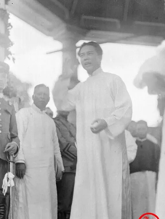 这个台上讲话的年轻人,长衫一色白,袖口空空荡荡,手一抬就带着风,台下几位抬头望,木柱遮了半截光,构图不算讲究,却把现场的声浪与节奏都收住了,爷爷说,以前听演说靠嗓门,现在话筒一插,千里之外都能直播了。