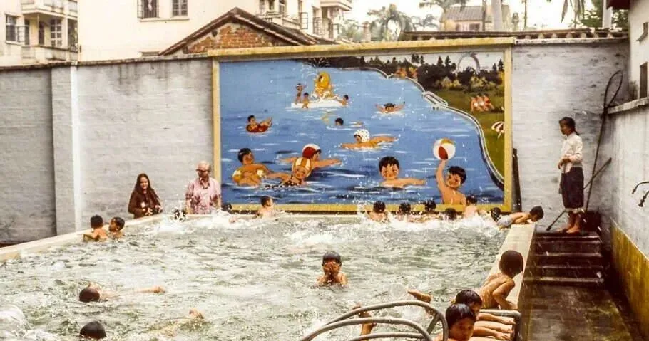 这个小池子是学校的露天泳池,水不深,边上立着铁扶手,墙面还画着儿童画,老师拿着竹竿在一旁看着,水花哗啦啦一片,小时候我们憋气比赛,输了的请吃一根冰棍。