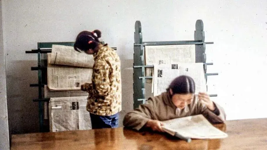 这个木头架子叫报纸架,粗糙的绿漆,报纸用长竹签穿起来,一翻就“哗啦”一声,两个女生一站一坐,盯着国际版不眨眼,那会儿消息慢,一张报纸看一天不嫌多。