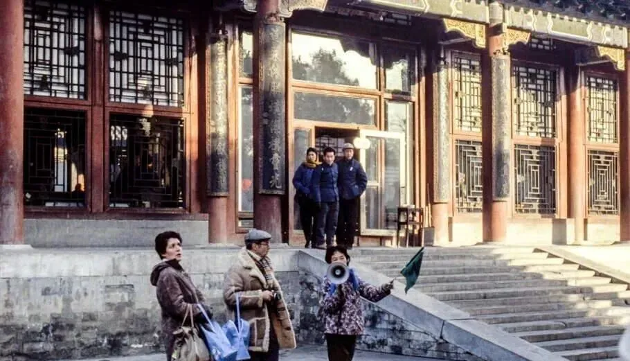 这个拿着小喇叭的是导游,手里一面绿旗,嗓门儿尖亮,边讲边走,故事一串接一串,外国客人听得直点头,好多词儿翻不过来,就用手比划,照样热闹。