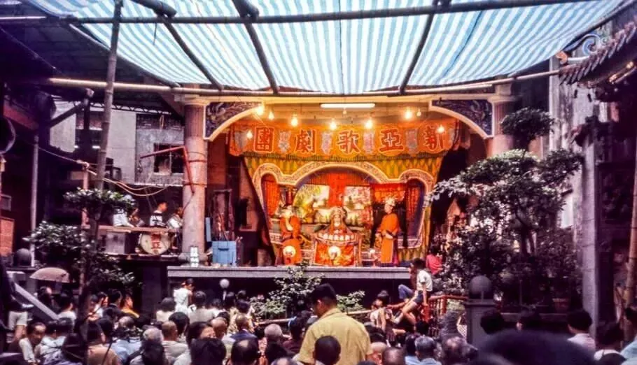 这张是露天戏台,篷布拉得紧,台口红灯一串串,锣鼓一响,孩子们趴着栏杆不撒手,曲牌子起落分明,老太太跟着台词往下接,比追剧还上头。