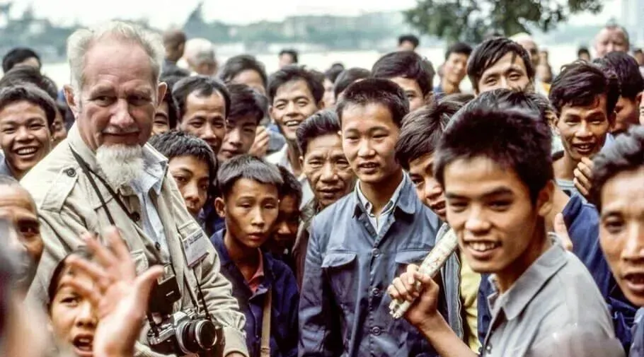 这张人堆里站着个老外,脖子上挂着相机,孩子们抻着脖子看,谁都好奇,第一次见生面孔,笑嘻嘻地问他“吃饭了没”,他听不懂,也跟着笑。