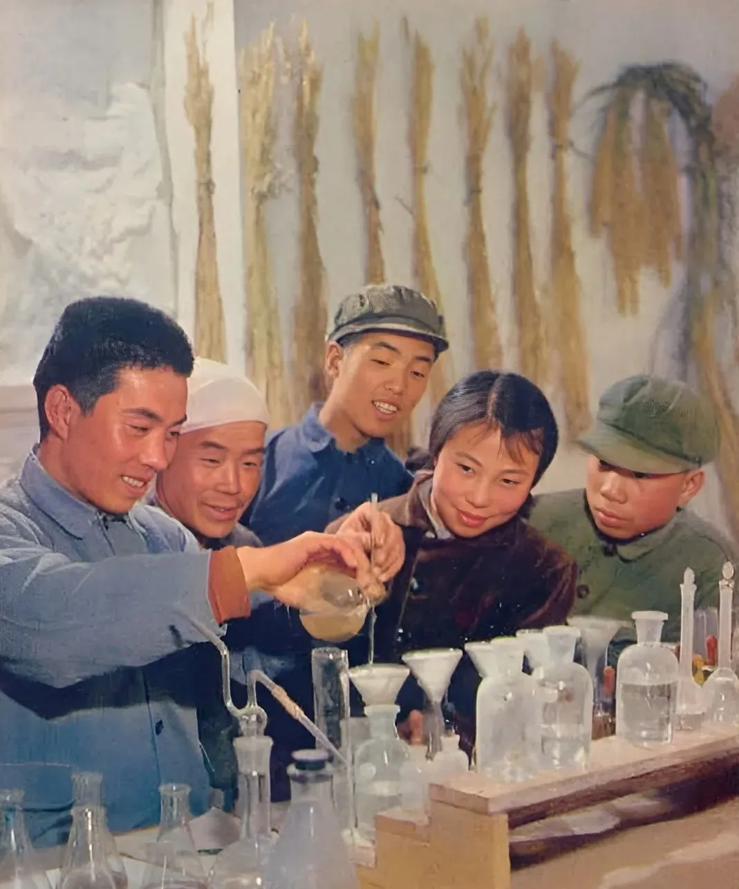 图里是公社的小实验室,玻璃瓶一排接一排,白色漏斗细嘴瓶,搁在木架上,年轻人眼睛亮亮的,往土样里滴着试剂,议论该施哪样肥更合适。