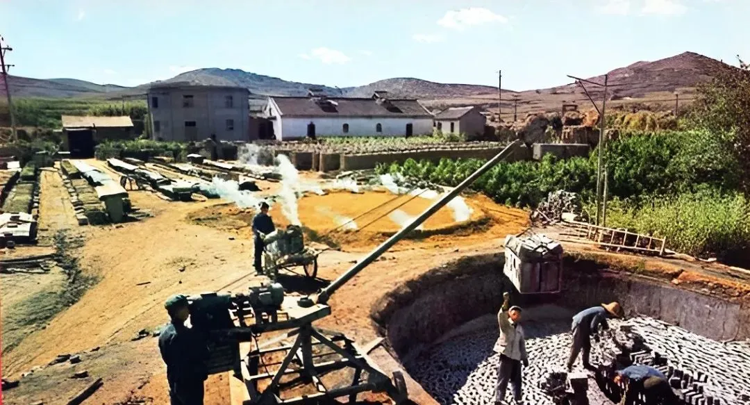 这个窑坑里白气往上冒,窑边木架子搭得牢,砖坯一块块码得齐,伙计挥手示意起吊,土路上留下车轮印,热浪烤得人脸通红。