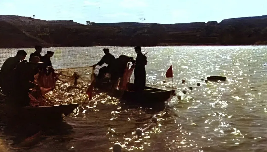 这是郭庄水库的打鱼,网从水里拖出来,水花碎成金光点,船头插着小红旗随波点头,岸上有人张罗着箩筐,等着把鲜鱼抬回去分工。