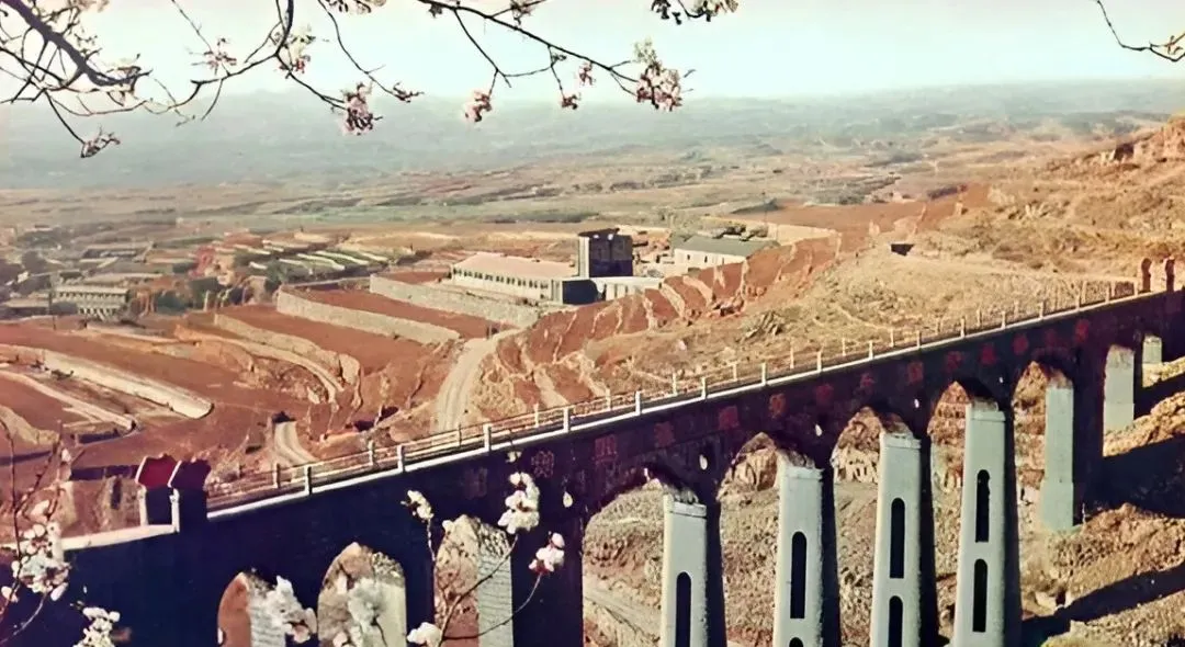 这个高个子是团结沟渡槽,水在槽里咕噜噜跑,桥孔像一连串眼睛望着沟壑,春天花枝伸过来,像给它点了个赞,1974年修的,村里到现在还念叨。