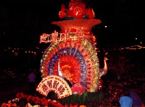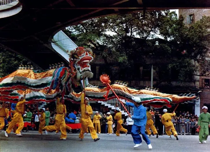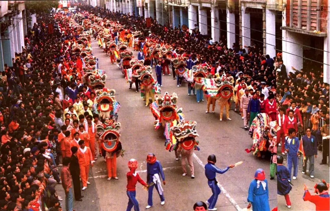 本文呈现的,是上世纪八九十年代广州市民欢度春节的集体回忆。1983年春节,市政当局举行规模盛大的娱乐昇平庆新春巡游活动,大量彩车和民间艺术表演从省体育场出发,经中山路、起义路抵达海珠广场。上图为领头的红棉造型的花车经过中山五路公园前越秀饭店的情景。上一年,红棉再次被定为广州市市花。图源:广州地区绿化委员会编著《红棉》画册上图为1983年春节的娱乐昇平庆新春巡游活动中,醒狮队伍途经中山四路财厅前。图源:1984年《广州》画册上图为1983年春节的娱乐昇平庆新春巡游活动中,番禺县的飘色在省体育场表演。图源:广州经济年鉴1983上图为1983年春节的娱乐昇平庆新春巡游活动中,舞龙队伍途经中山五路公园前的八爪鱼天桥。图源:广东艺术摄影作品选1984,黄容光摄