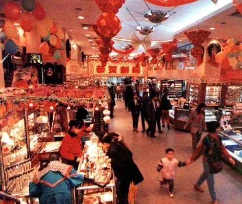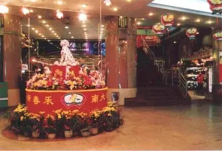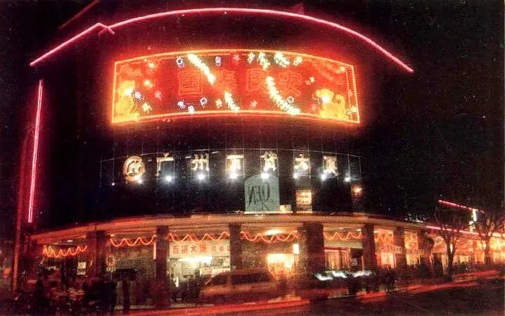 上世纪七八十年代,市内各大公园每逢春节都会举办花会。上图为1983年文化公园迎春花会。图源:广州地区绿化委员会编著《红棉》画册春节期间,广州市内各大商场都会安排促销活动并布置一新。上图为1994年春节摆出斑点狗公仔的南方大厦百货商店。图源:广东办事指南1994上图为1996年春节期间,充满喜庆气氛的华夏百货公司。图源:广州年鉴1996为营造喜庆氛围,每当华灯初上,街道上会亮起五光十色的广告灯牌。上图为1994年春节,北京路广州百货大厦外墙挂上包含狗仔造型的「国泰民安」灯饰。图源:广州年鉴1995除了行花街和探亲访友,广州市民的春节文娱活动也在改革开放后恢复正常。1979年第一届省港杯起,每年的省港杯足球赛都在春节期间举行。上图为1979年第一届省港杯在越秀山体育场举行时的情景。图源:1984年《广州》画册广东观众历来不看北方的春节联欢晚会。除了行花街,广东人也可以选择安坐家中观看由广东电视台制作的春节晚会。上图为1990年春节,广东电视台在落成不久的广东彩电中心举办的春节晚会现场直播。图源:1995建立广东发展新优势研究成果汇编