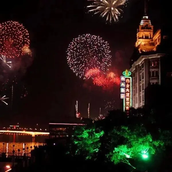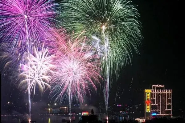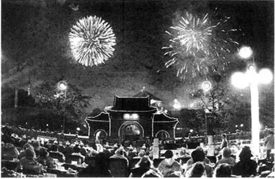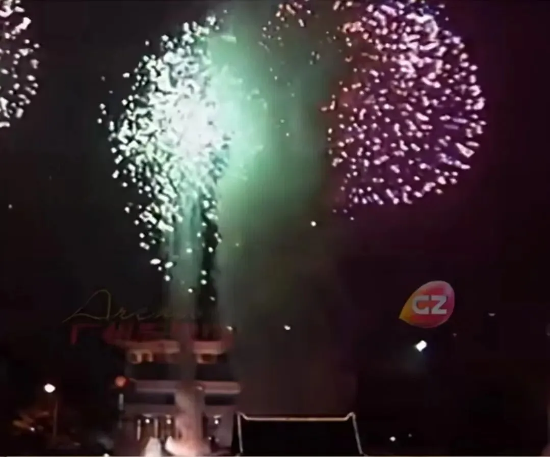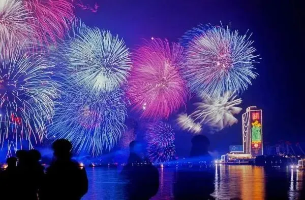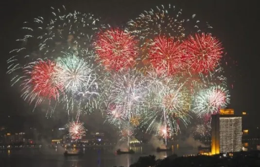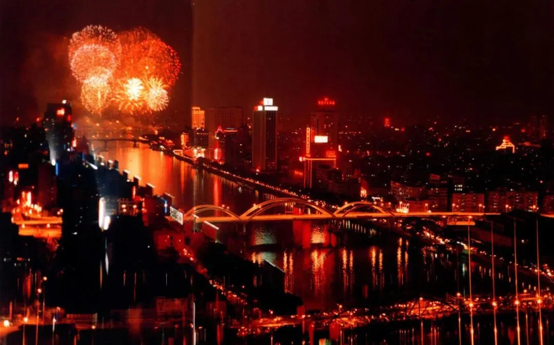 1995年春节,广州市第一次举办春节烟花晚会,时任广州市市长黎子流与广大市民在市人大大楼前,观看在纪念堂一带燃放的灿烂烟花。图源:广州电视台影像资料/广州日报1996年农历大年初一,广州的春节烟花汇演首次在白鹅潭举办,广大市民纷纷来到白鹅潭畔观赏烟花。图源:羊城晚报记者 陈秋明 摄