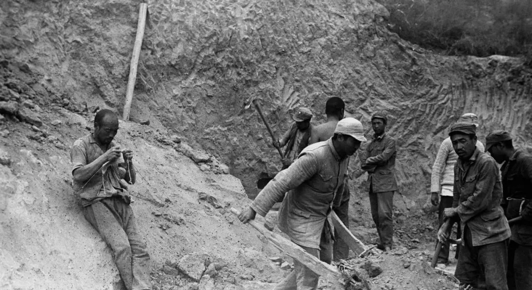 图里一群人在挖土修路,最有意思的是土坡上那位,胳膊夹着线团,低头在打毛衣,针在指间来回窜,旁边的人抬头看了一眼,乐得直喘气,这手上活儿,跟干活一样熟。