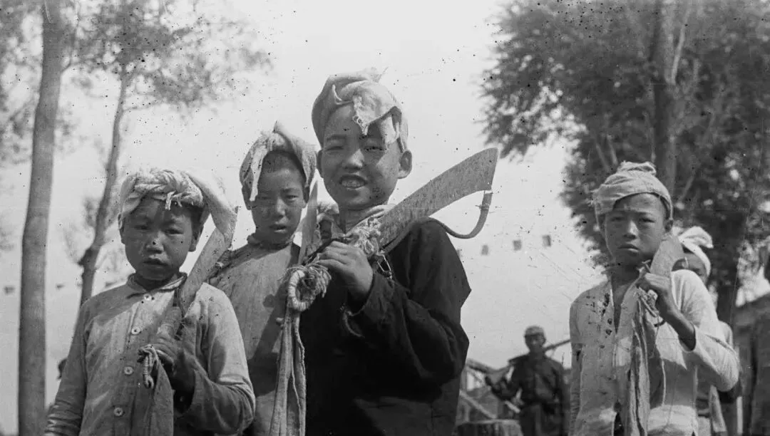 几个小孩儿扛着大刀,刀背厚,刀尖弯,绑着粗绳子搭在肩上,头上扎着白头巾,笑容还带奶气,弟弟看见这张,嘟囔一句,现在背的是书包,那时背的是家国。