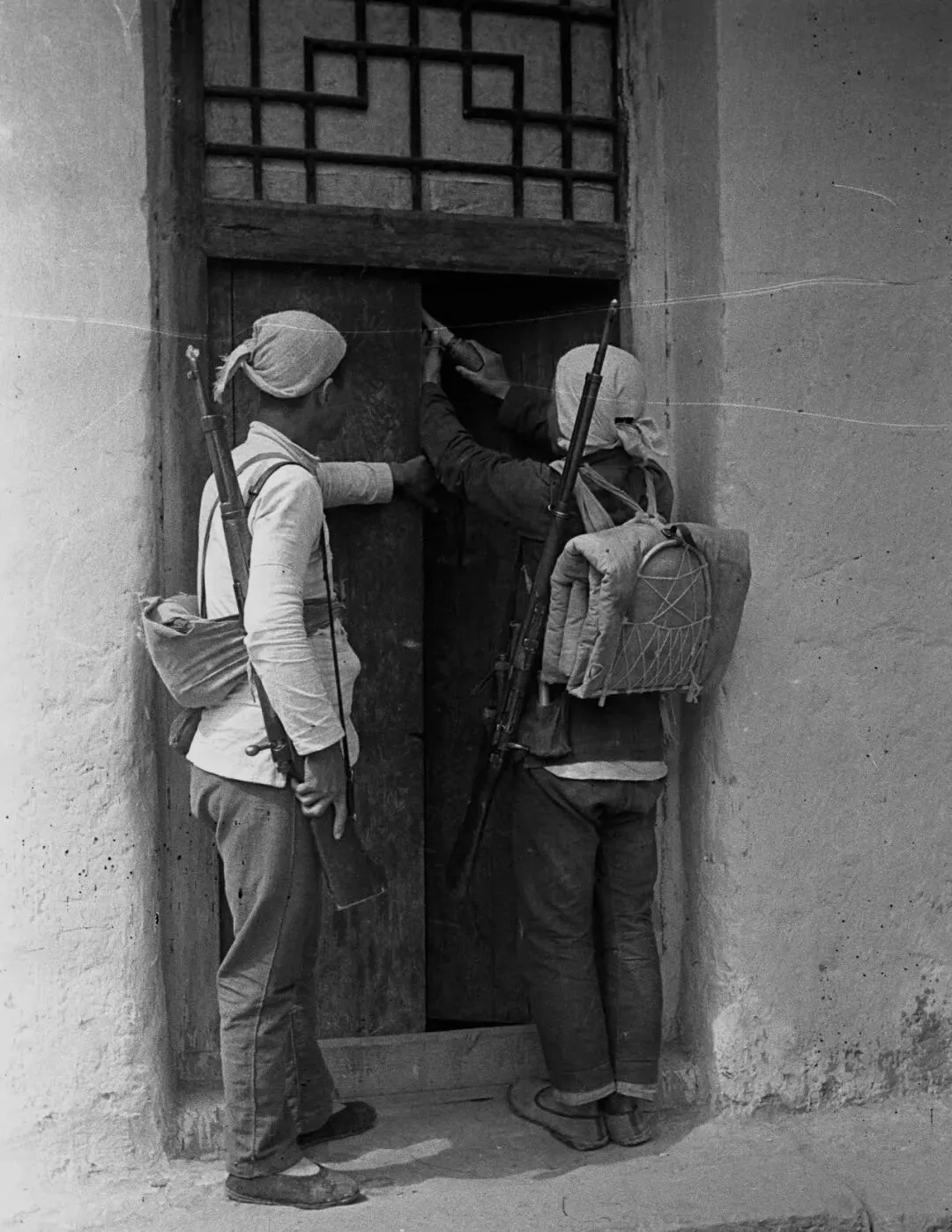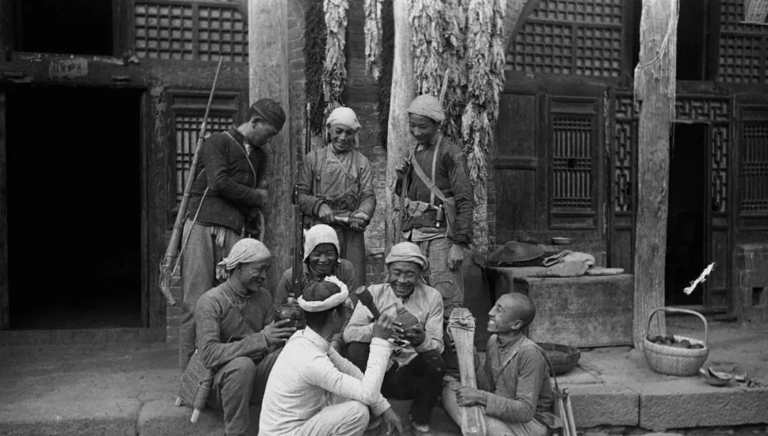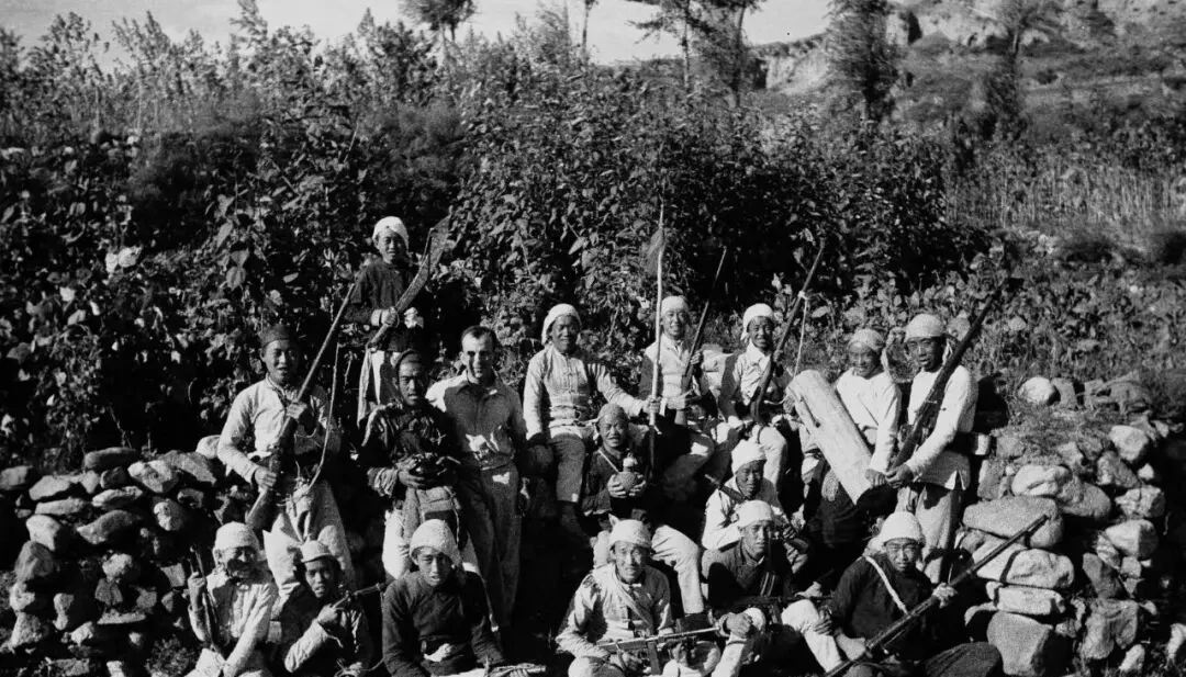 这张是民兵们和来访者的合照,前排人手里拿得各不相同,有土枪有洋枪,还有自制的木炮,坐在中间那位托着个异样的武器,叔叔眯着眼凑过来问,这可是洋货。