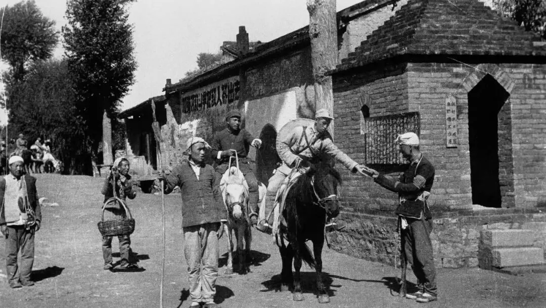 这张是在村口,门洞下阴影凉飕飕的,侦查员把路条递过去,民兵低头看,手指头在纸边上抹了一下,说行,你们进去吧,旁边的墙上有个方格窗,透出一点点光。