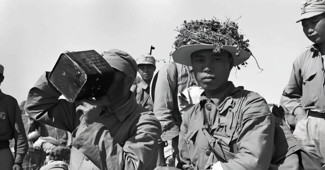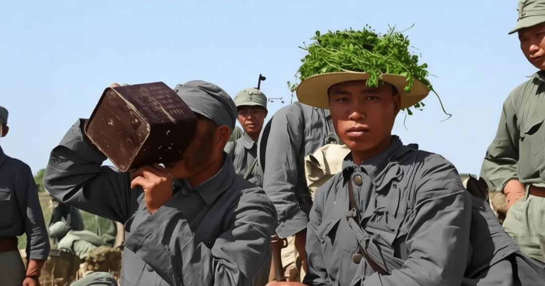 这个草帽叫遮蔽帽,帽檐宽,边上穿孔好塞草,图里小伙把青绿的草一股脑压上去,帽子马上“活”了起来,旁边那只方方正正的铁皮罐是油漆桶改的水壶,拧掉盖子就能咕嘟咕嘟灌,憋得腮帮子发鼓,小时候我在外婆家的仓房也翻出过同款,边角划手,可结实,外婆说打仗年头啥都得挪着用,有水能喝就不挑容器。