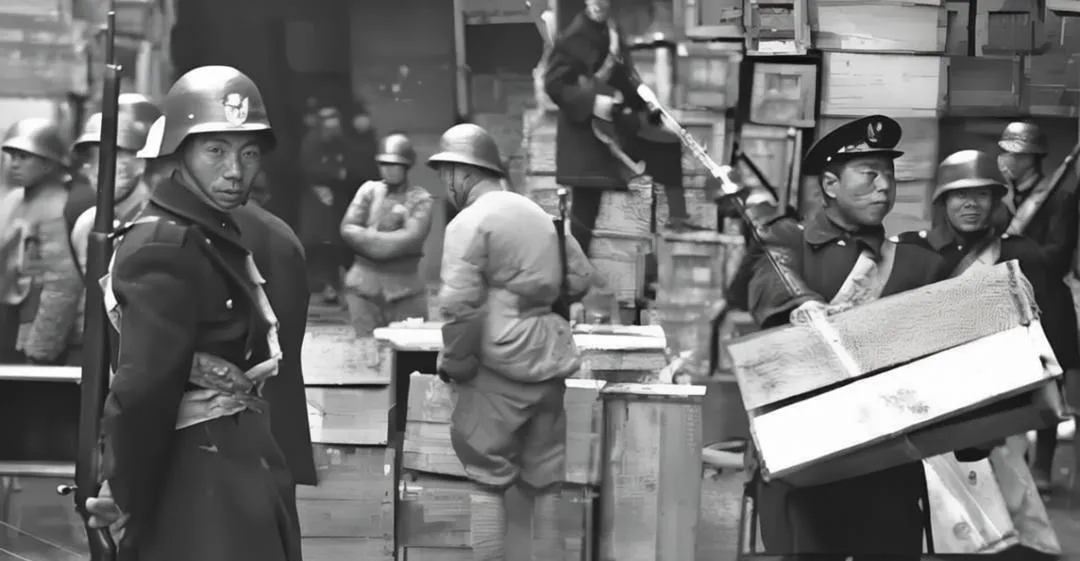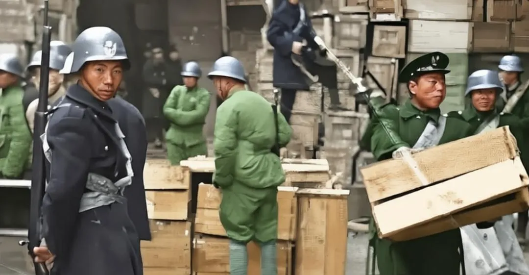 这堆木箱是军需箱,杉木板钉的,箱扣是铰链加铁搭钩,咣当一声能震灰,前头两位穿黑呢大衣的是宪兵,肩上绑着白色斜带,钢盔是圆顶的旧制样式,漆面发亮,枪管冷得冒气,叔公说过,打到仓口都是短兵相接,身上的东西越硬挺越像甲,心却不一定硬,照片上色后,那块绿呢料的冷与箱木的黄,撞在一块儿,光看就觉得凉。