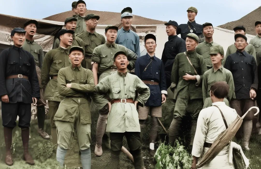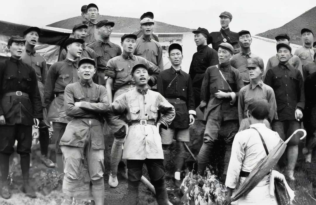 这群年轻人穿的是杂色军装,灰的绿的蓝的都有,腰带一勒,口袋鼓鼓的,站成三排,嘴巴张得圆圆的,指挥在下头举着胳膊,他们唱的多半是**“我们是抗日的铁军”**那路子,节子明快,能把人从困意里拽起来,我外公当年在学校操场也唱过,说开口那一瞬,浑身都是劲儿,没鼓也能把地踏得咚咚响。