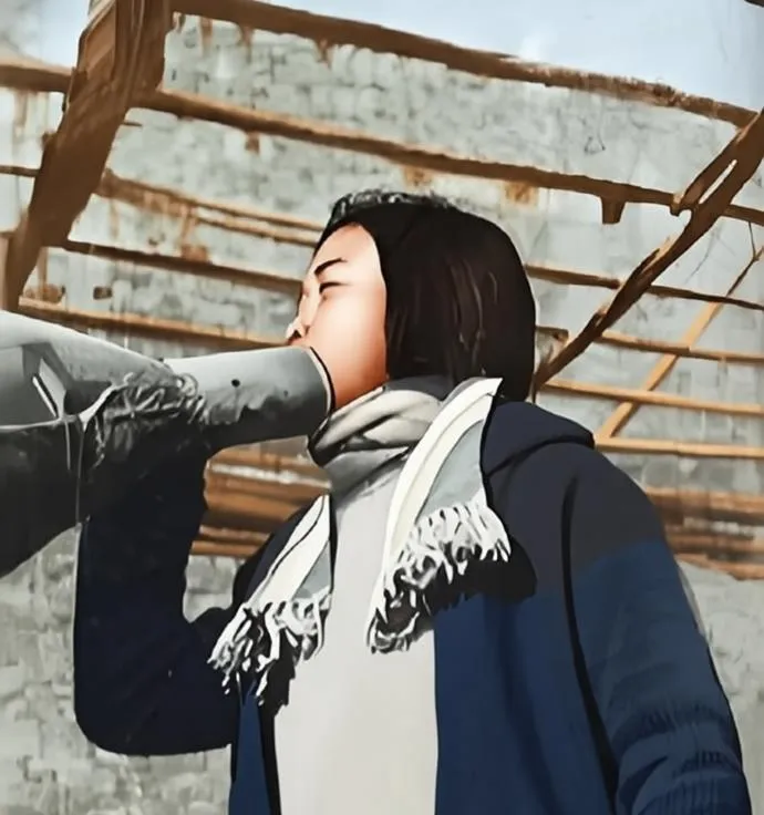这个灰色的圆锥就是铁皮喇叭,边缘翻折一圈防刮嘴,图里姑娘把口抵上去,围巾毛穗被风一拨一拨的,嗓门穿透砖墙,妈妈说看见这样的身影就会想起“书包还在肩上,话却比刀锋利”,以前要过门槛得先喊出来,现在拿起手机敲两行字就能扩散,容易是容易了,气口却稀了些。