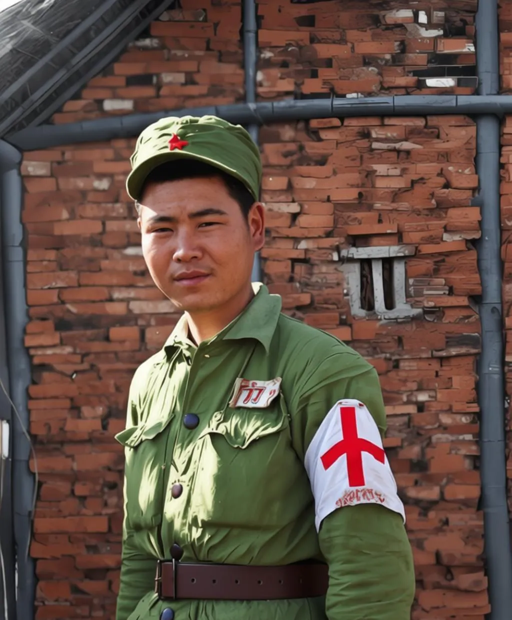 这块白布袖章上印着红十字,扎在军医的左臂,边上还写了小字,雨淋日晒都糊成毛茬了,衣服是草绿色棉布,胸口两只翻盖袋,铜扣发青,腰间一条皮带勒出褶子,爸爸看见这张图就说一句,“能背回一个算一个”,那会儿止血包就是纱布和绷带,有时干脆上块煮过的棉布,别讲究,先把命拽住再说。
