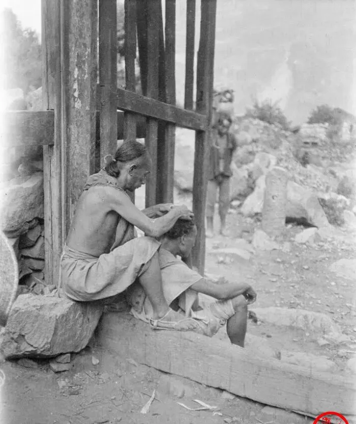 图中这动作叫捉虱子,老汉盘腿坐在木梁边,手指在孩子的发缝里一撮一撮抿着找,指甲一扣就往梁角一弹,咔哒一声脆响,衣衫破得见骨节,肩胛上的筋像绳子一样绷着,那会儿洗头是奢侈,日头一出来就坐门框底下捉一阵,孩子困得直打盹,也不敢乱动,奶奶说别嫌脏,这就是那时候的“理发店”。