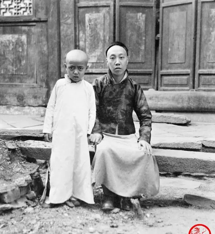 这张端坐的人像最显规矩,大人穿绸面长袍,小孩剃着亮脑门,衣料顺得能照见门槛上的光,坐姿讲究,手心按着衣边,家里人说这就是“有身价”的样子,旁边的泥地照样坑坑洼洼,门里门外两重天,看着怪扎心。