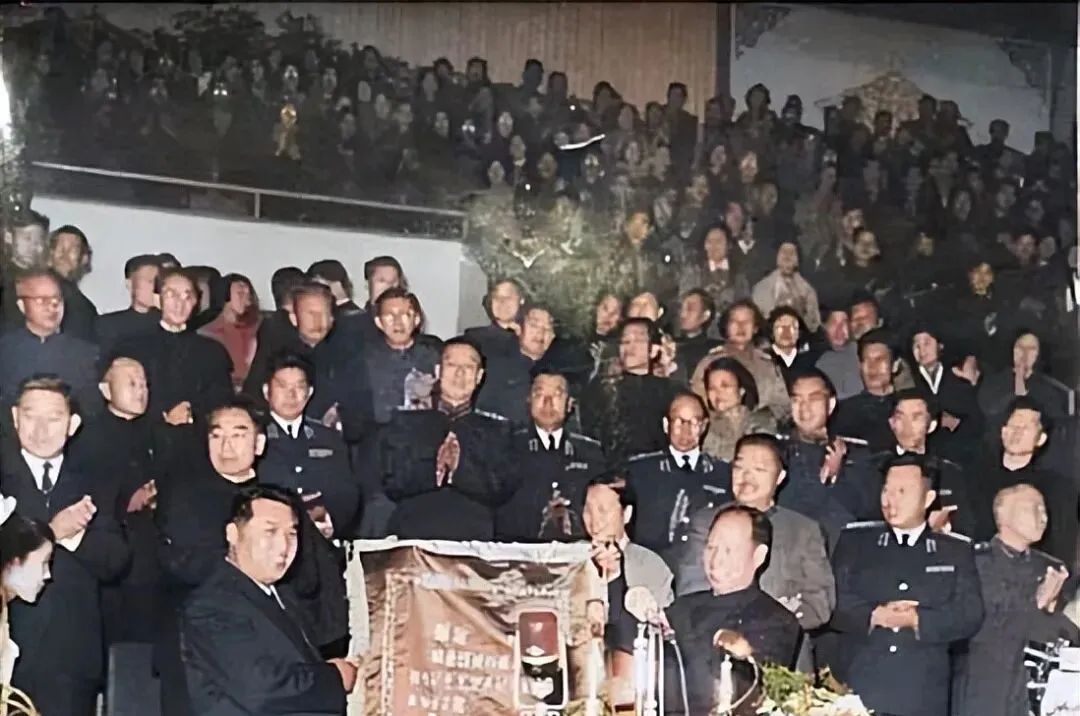 这个场面叫欢迎大会,礼堂里人挤人,军装领章在灯下有点亮,前排有人鼓着掌,后排撑着脖子往前看,奶奶说那会儿赶这种会,脚底下穿的是千层底布鞋,挤得脚背都发麻,也要把掌声打实在,就怕来宾听不见,照片一上色,连那盏钨丝灯的微黄都能闻出热度。