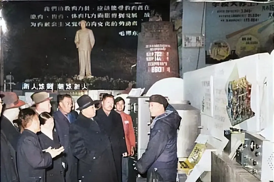 这个场景叫调研,解说员戴着棉帽,手里比划着设备的接头,身后一排机器冷不丁闪着钢光,墙上大字标语压着一行行口号,外衣纽扣扣得很紧,说明屋里并不暖和,爸爸看了笑我,说你看人家参观,眼神都落在器物上,不像咱现在开会先找摄像头在哪儿。
