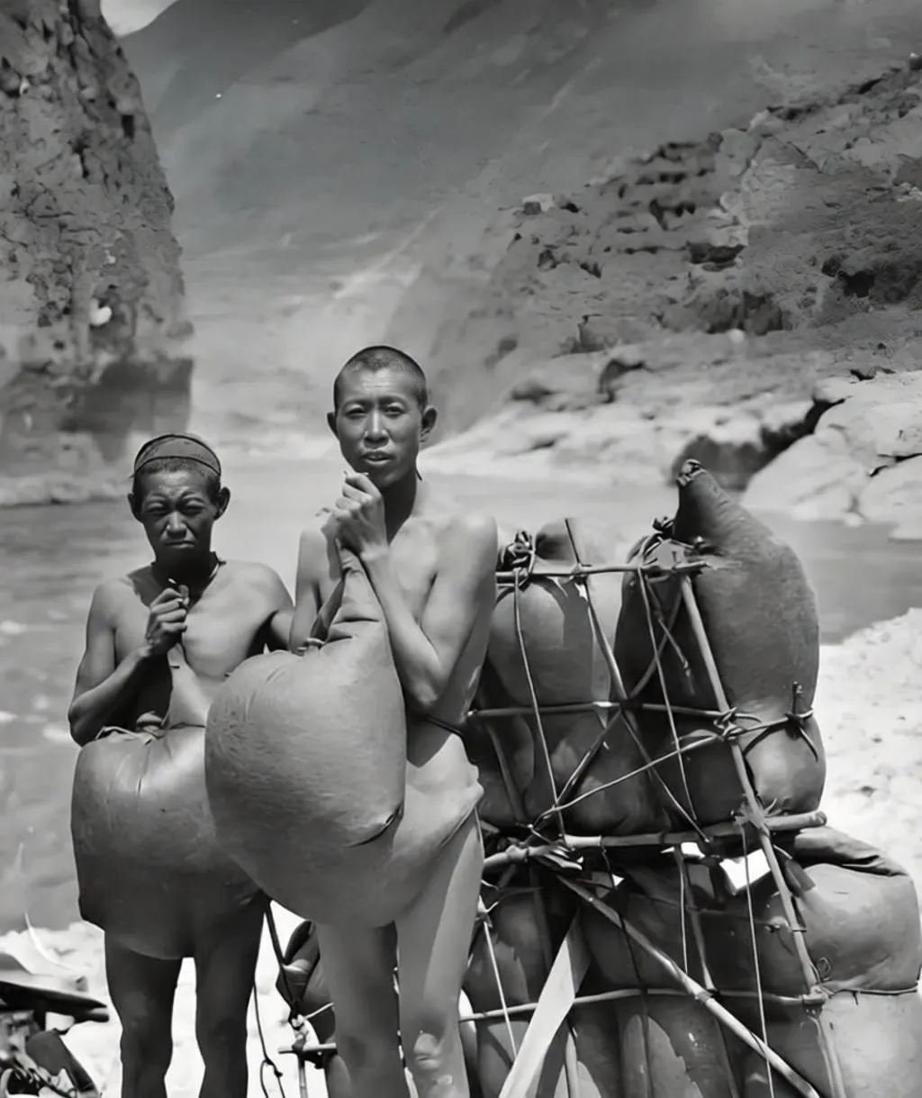 这个充气的皮囊叫羊皮浮筒,身侧绑着整排羊皮筏,筋绳像鱼网一样交错,站在江风里,皮面泛着蜡色的亮,拍出来能听到“呼哧”两口气的味道,舅舅说渡江要胆子也要手劲,皮袋子漏不漏气,一摸便知,放到今天,换成救生衣和发动机,省力是省力了,浪头的敬畏可不能丢。