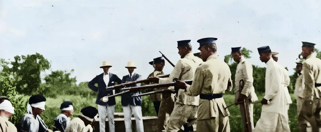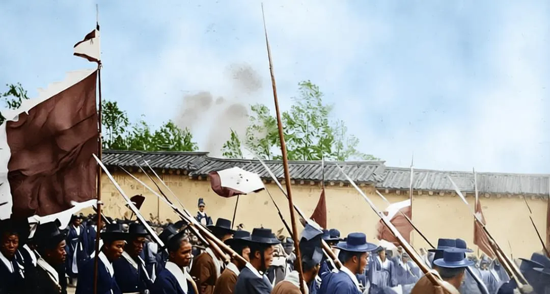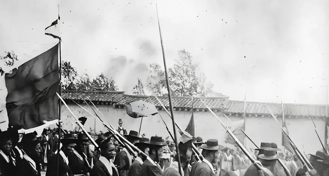 这叫步队行进,长枪的刺刀冷冷竖起,布帽檐子压得低,旗角被风掀起一撮白边,脚步不快却整齐,像鼓点敲在尘土上,照片一上色,蓝灰的军袍就从黑白里跳出来,显得克制又倔强。