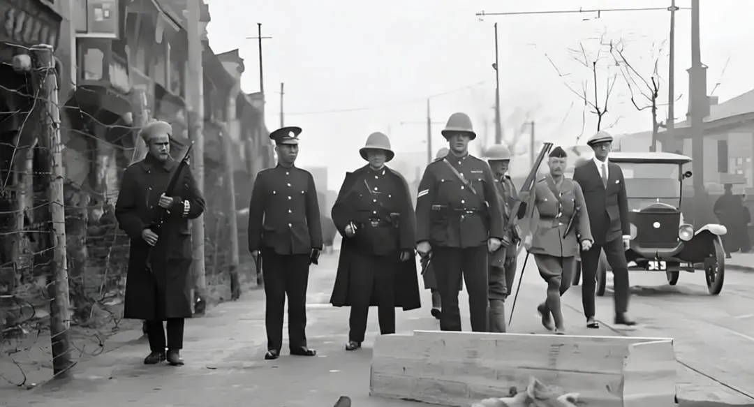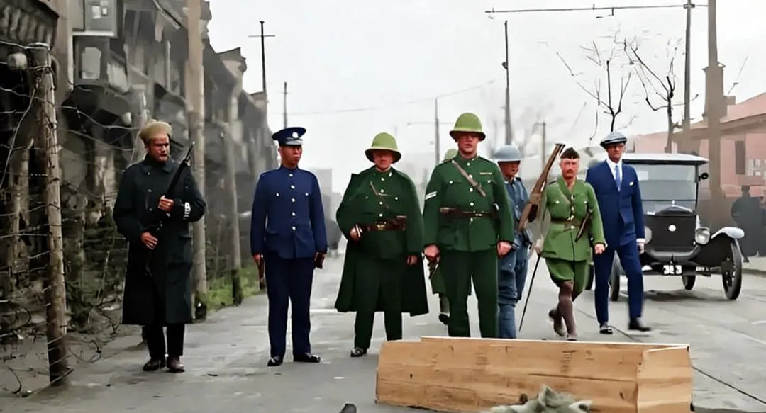 这条路上铁丝网沿街拉着,几种制服并排走,钢盔、呢帽、礼帽,各执一词,后面老式轿车慢吞吞跟着,路边木箱倒着,像刚被人踢开一脚,一张照片把城市的复杂都端出来了,现在看,最刺眼的是那几道隔离网,人和人被生生分开。