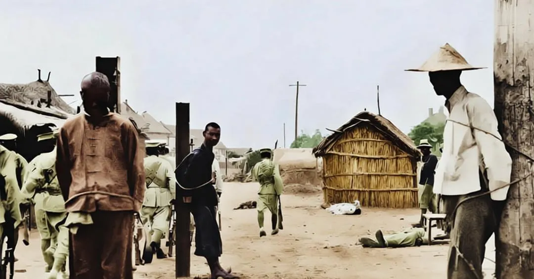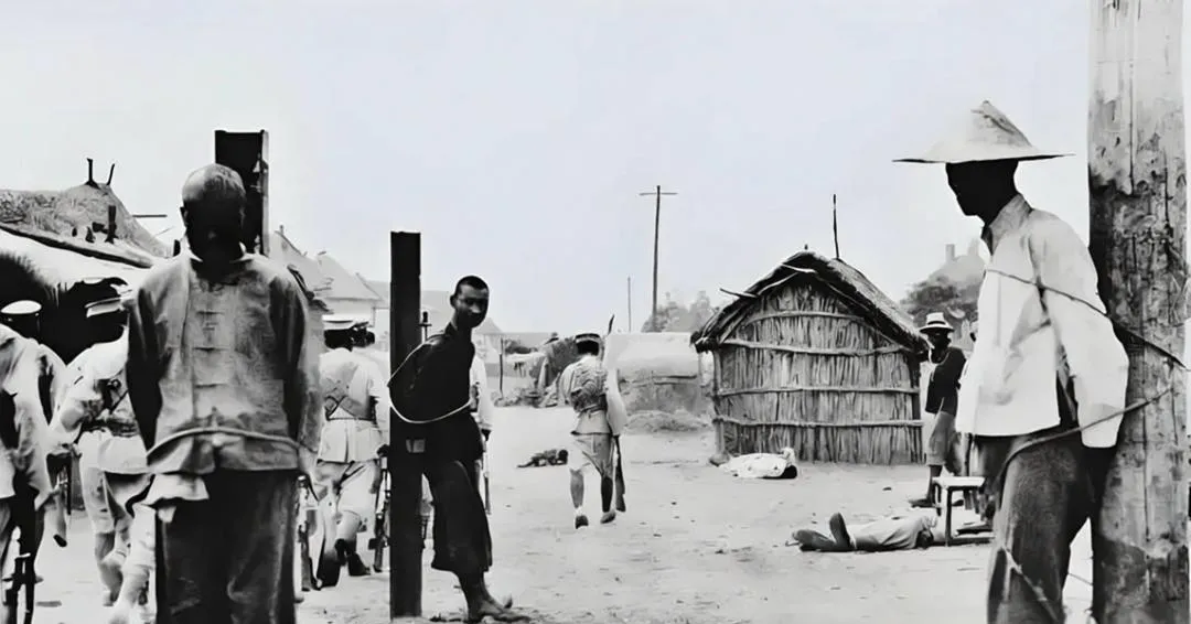 这根木桩叫示众桩,绳子勒在手臂上出了印,地上混着草屑和沙土,远处还有倒下的人影,小卖摊的芦席墙被风吹得拍打呼呼作响,颜色上去后,那一股土腥气更近了些,历史不是抽象名词,是有人疼有人痛的现场。