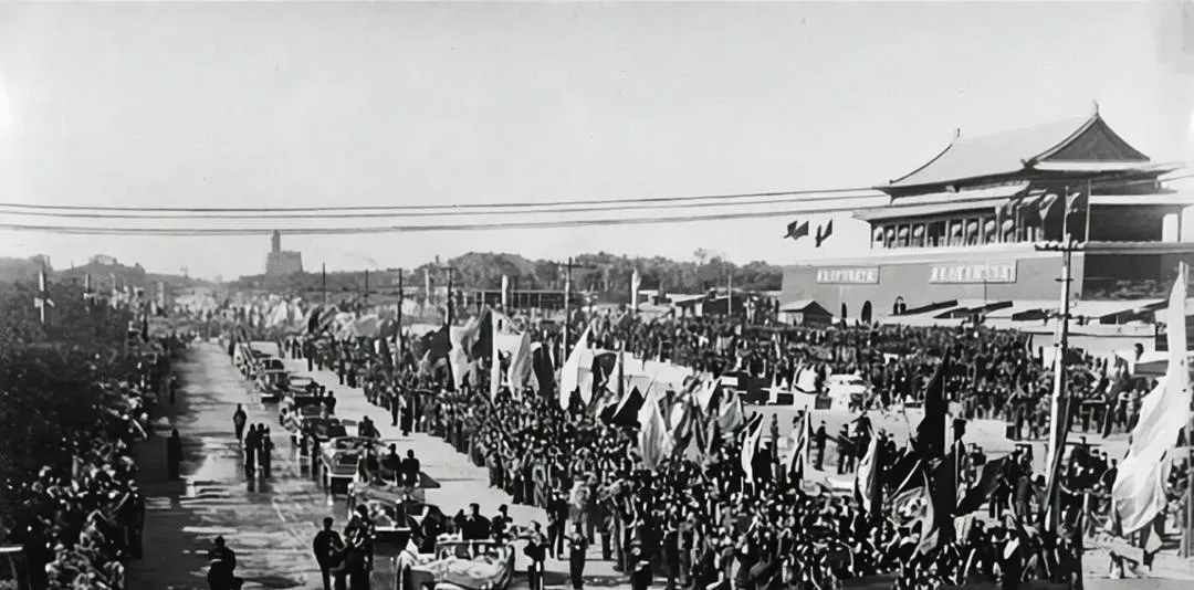 图中敞篷车擦得锃亮,红棕色的发动机盖像刚抹了油,黑呢大衣的衣领立得笔直,枝柳被风一拂就散开,横幅上“世界人民”几个大字鲜红,车里的人抬手致意,沿街的旗子一排排晃,爷爷说那年单位组织去街边列队,他站在最外一层,袖口里塞着暖手的棉花,喊哑了嗓子也不肯停,那个年代欢迎友人,就是这样热辣辣的场面。