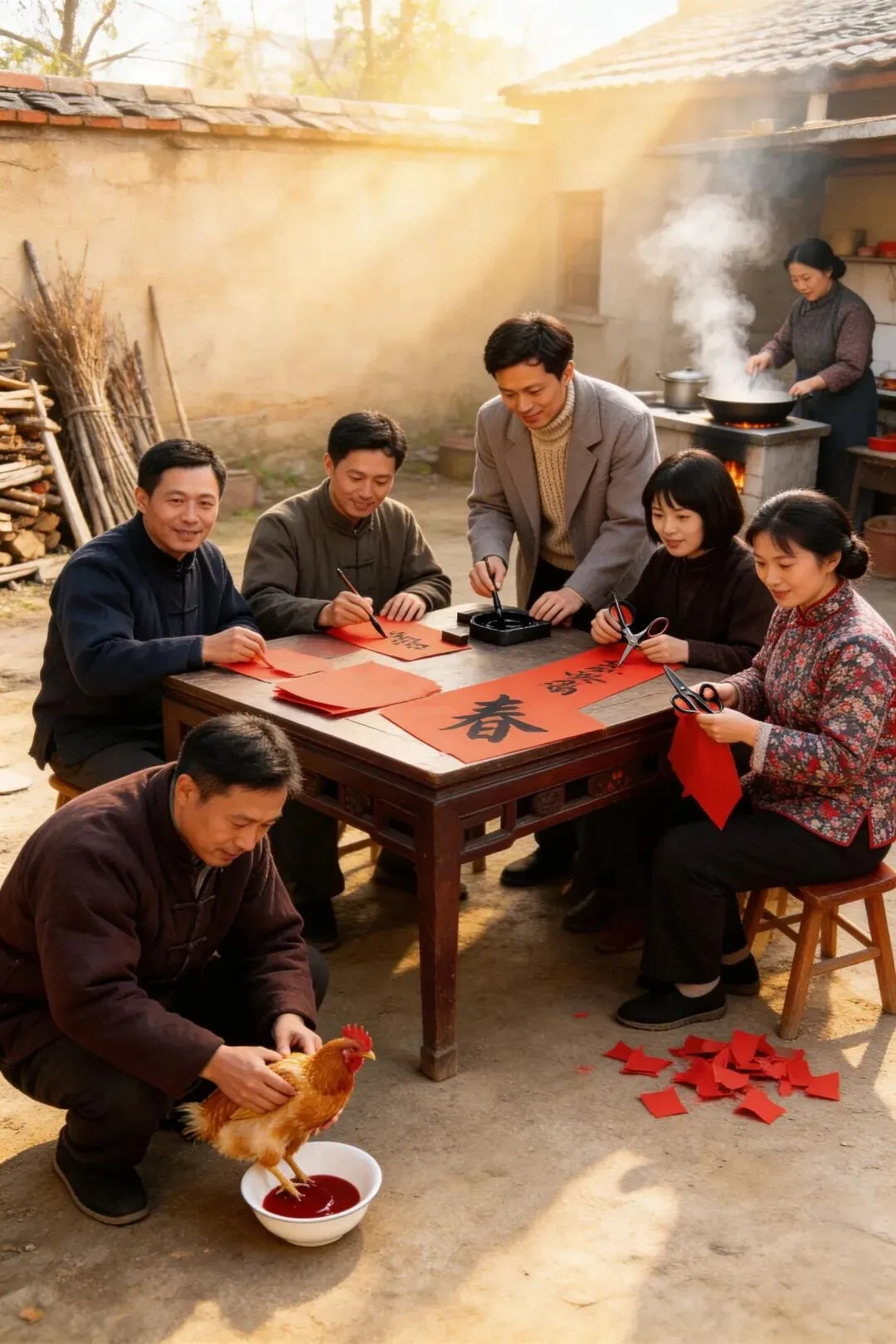 除夕早上,大哥就扫院子,他永远是我们姊妹中最勤快的那个。早上的厨房里飘来阵阵包子、馒头的清味,(那是大哥从长沙带回去的),甜酒冲蛋的芬芳扑鼻而来。吃完早歺,姊妹们就张罗写春联。我与大嫂裁红纸,大哥又摆桌子又磨墨,二哥、三哥在对对联,最后是二哥挥笔写前大门对联,三哥写了窗联。母亲煎茶弄饭忙不停,父亲在一边杀鸡、剖鱼……当天太阳正好,我们身上都能闻到阳光的味道。
