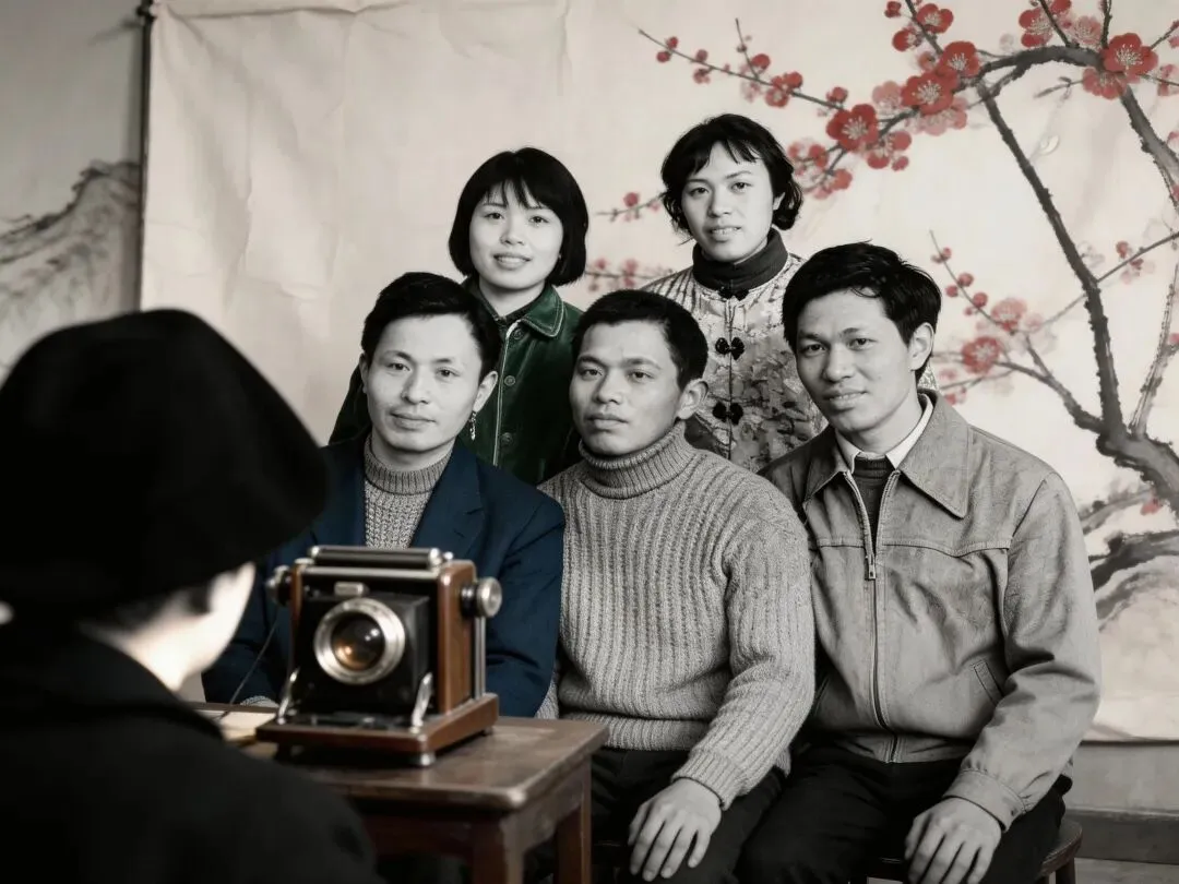 我们站到那丛画出来的梅花跟前。老师傅把头钻进黑布里,瓮声瓮气地指挥:“那位同志,头往左偏一点……对。笑,哎,就这样!”镁光灯一闪,嘭的一声,一九八二年大年三十的我们,就定格在那帧照片里。