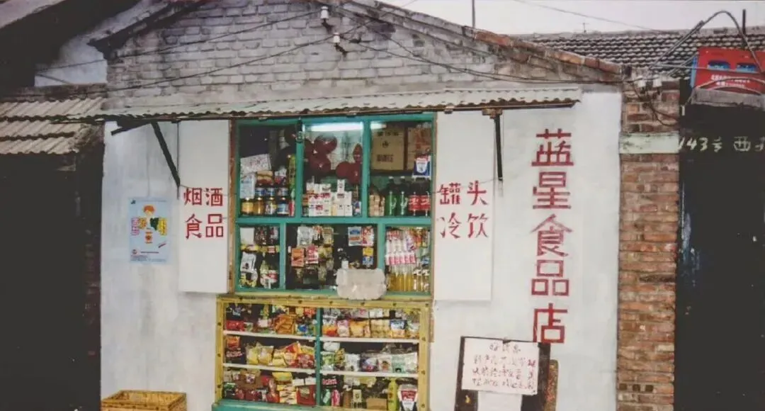 这个小店叫蓝星食品店,绿漆木窗格子里塞满玻璃罐和小包装,话梅陈皮橘子汽水排成队,门口用红字写着烟酒食品和冷饮,妈妈说记账本就挂在柜台下边,抬手一翻写着谁家几毛钱,那会儿冰棍儿得用剪子咔嚓剪半根,现在扫码枪滴一下,谁还抄账本。