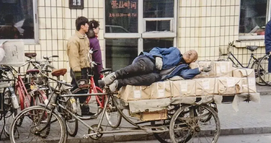 图中这辆叫平板三轮,车板上码着牛皮纸包,师傅横着一躺,胳膊当枕头,车圈上粘着泥点子,链条干得发响,他这一觉多半是等活儿的空当补一会儿,小时候我跟着爸爸路过,爸爸小声说别吵着人家,力气都是攒着干活使的,现在快递车飞来飞去,三轮越来越少见。