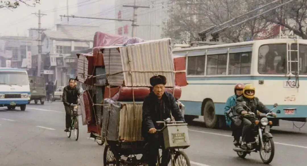 这个阵仗叫三轮拉大件,褥子床垫和柜门一层层捆好,粗绳勒出几道白印,车把前挂着“搬运服务”的铁牌,师傅戴着大狐皮帽子,往前一蹬车就稳稳走了,后头的公交和摩托鸣喇叭给他让道,那会儿搬家靠人抬车拉,现在一口气来四个搬运工,打包上楼都不用你动手。