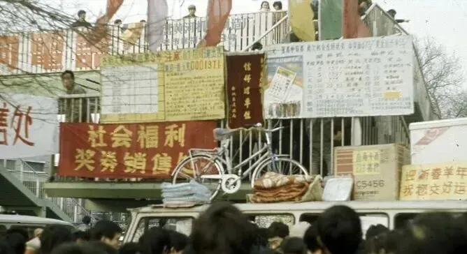 这堆大红大黄的叫奖券宣传摊,横幅外挂着,自行车压上栏杆当招牌,喇叭里喊着今天有大奖,叔叔说别想发财,买一张就是图个乐呵,人挤在梯子口抻着脖子看号码,现在手机里戳两下,喜忧都安静。