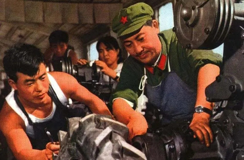 这个场景叫车工带徒,老师傅戴着绿帽沿,手搭在粗糙的机床外壳上,袖口油光发亮,徒弟眼睛盯着刀尖,火花一蹦,铁屑卷成金黄的螺旋,爷爷说那会儿讲究跟着干学着做,没有多余废话,拧紧一颗螺丝心里就踏实。