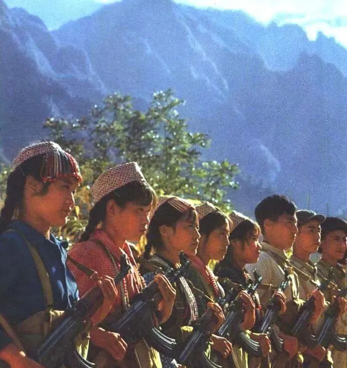 这排队列里,姑娘小伙肩上挂着步枪,山风一吹,头巾的穗子轻轻摆,站得笔直,谁都不眨眼,那个年代的英气就是这么练出来的。