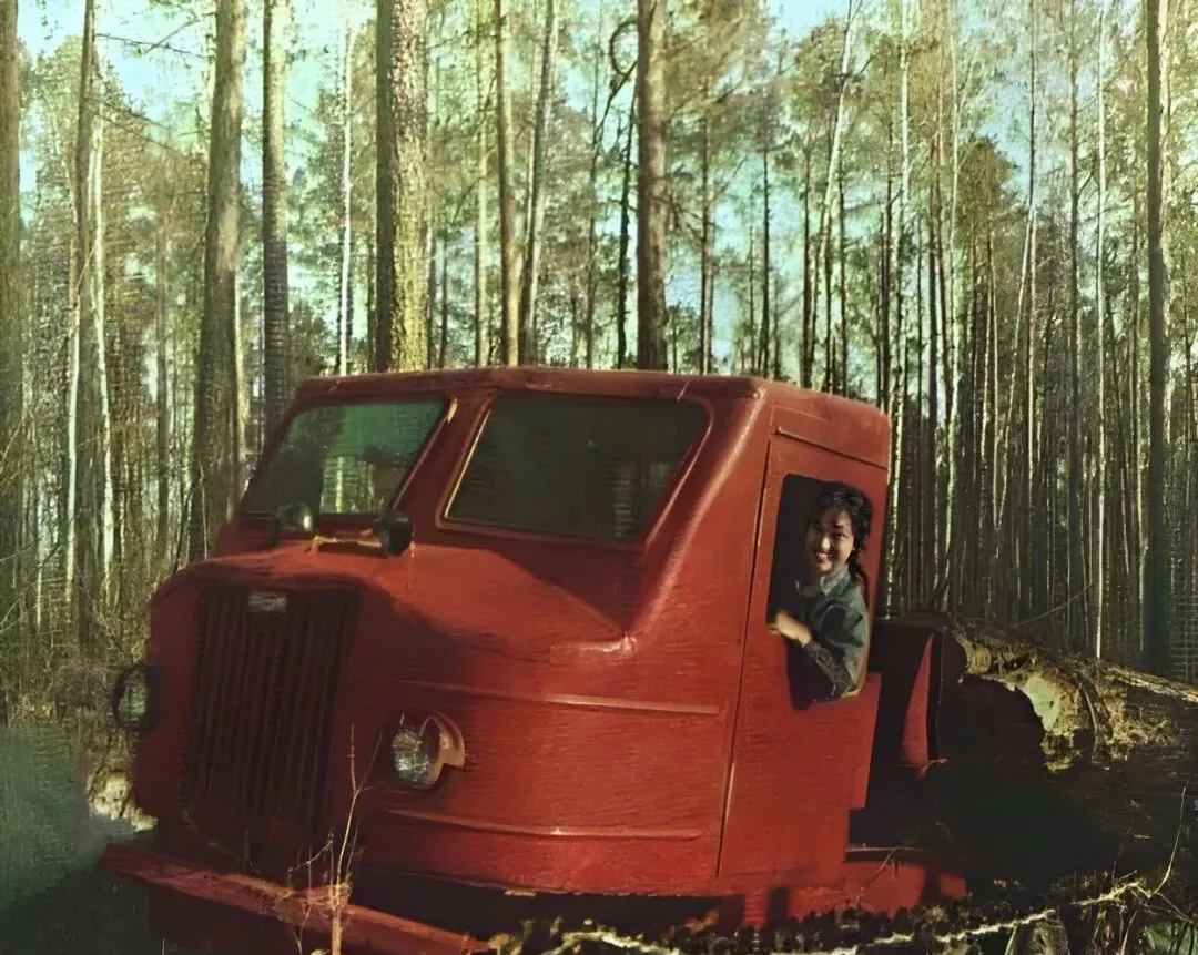这台方头红车叫履带拖拉机,女司机胳膊搭在窗沿,嘴角翘着,车身上泥点子一层又一层,拐进林子时轰隆隆的声浪能把鸟惊起来,可她不慌,油门一收就稳住了。