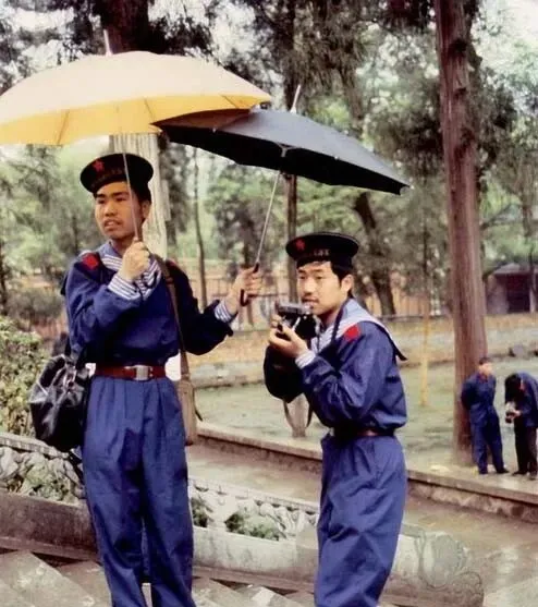 图中的两位水兵手里撑着伞,一个举机取景,一个抬头看光,蓝制服板正,雨丝细细落,年轻人拍照就当件新鲜事,挣下假期第一件事就是留影。