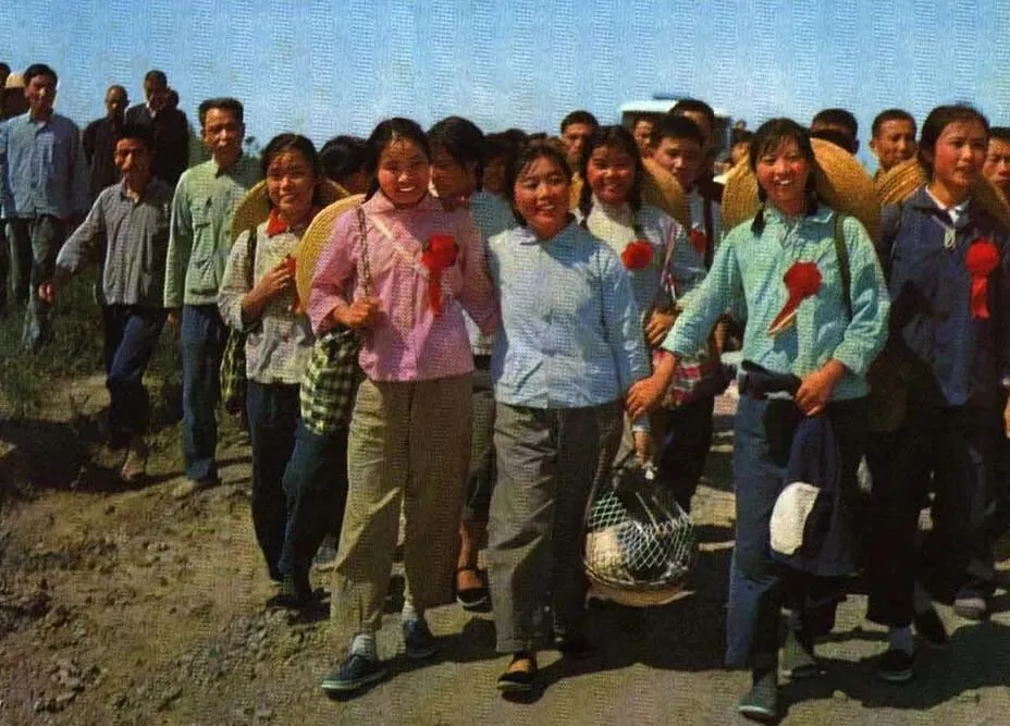 这个队伍叫下乡报到,红花别在胸口,肩上背篓里塞着被卷和铝饭盒,谁也不说累,边走边唱,村口老叔冲着她们摆手,笑里有不舍也有盼头。