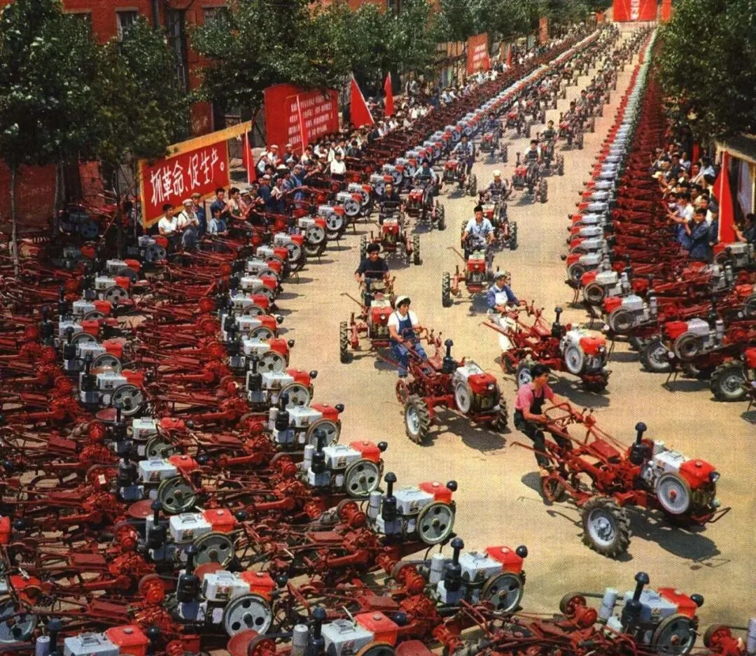 这一排排红铁牛叫手扶拖拉机,管子冒着热气,铁轮子新得能照人,司机们一声吆喝,整齐开到大路上,真叫人看得心潮澎湃。