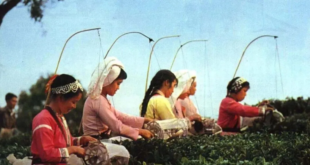 姑娘们肩上挑着弯竹杆,下面挂着手摇采茶机,咯嗒咯嗒一转就装满半筐,手指还是要去拣嫩芽,奶奶说以前一片一片掐,现在省力多了,手也不疼。