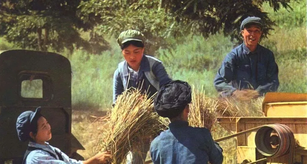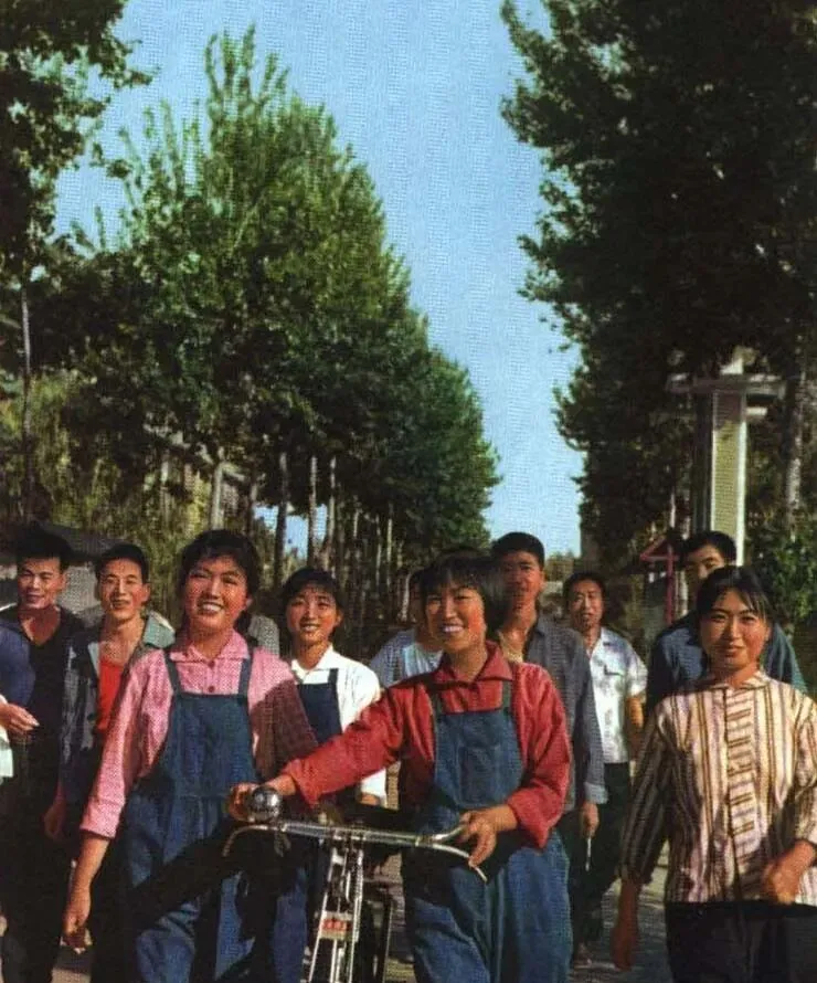 图中这面大红旗最显眼,绸面光亮,旗杆粗实,姑娘们一手扶旗一手提锄,步子一齐迈着,口号一喊,路两边的白杨树都跟着起劲,妈妈说那时候去开沟引水,天再晒也不掉队,回村晚了,锅台上的玉米粥还热着。