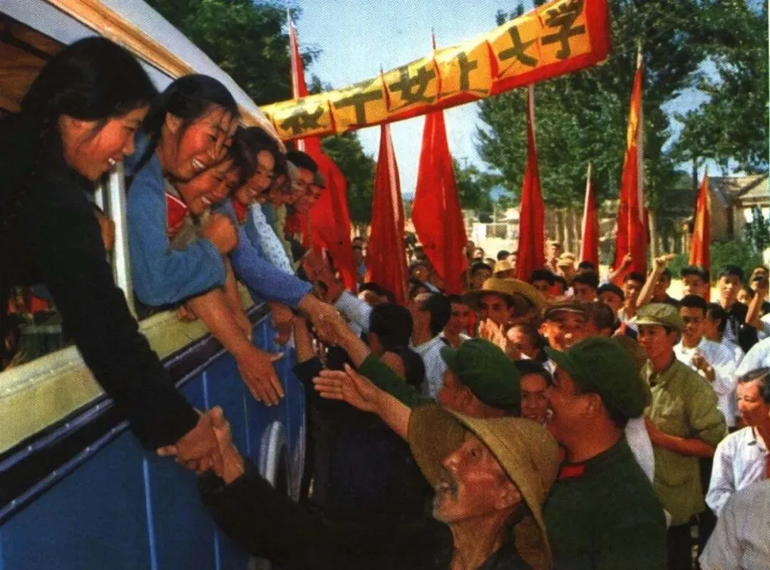 这条横幅写着工农兵大学,车窗探出一排笑脸,台下的手一只接一只,拉着不松,老大爷说好好念书,回来给咱村里长长脸。